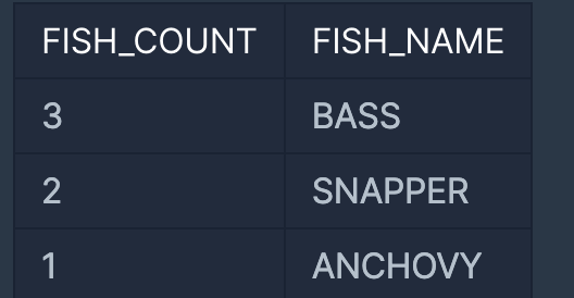 2. 그리고 총 개수 COUNT(*) 와 FISH_NAME 을 각 테이블에서 추출하고 개수를 FISH_COUNT 로 명명한다.
